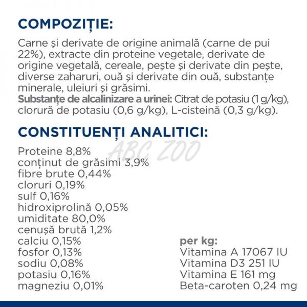 COMPOZIŢIE: Carne şi derivate de origine animală (carne de pui 22%), extracte din proteine vegetale, derivate de origine vegetală, cereale, peşte şi derivate din peşte, diverse zaharuri, ouă şi derivate din ouă, substanţe minerale, uleiuri şi grăsimi. Substanţe de alcalinizare a urinei: Citrat de potasiu (1 g/kg), clorură de potasiu (0,6 g/kg), L-cisteină (0,3 g/kg).