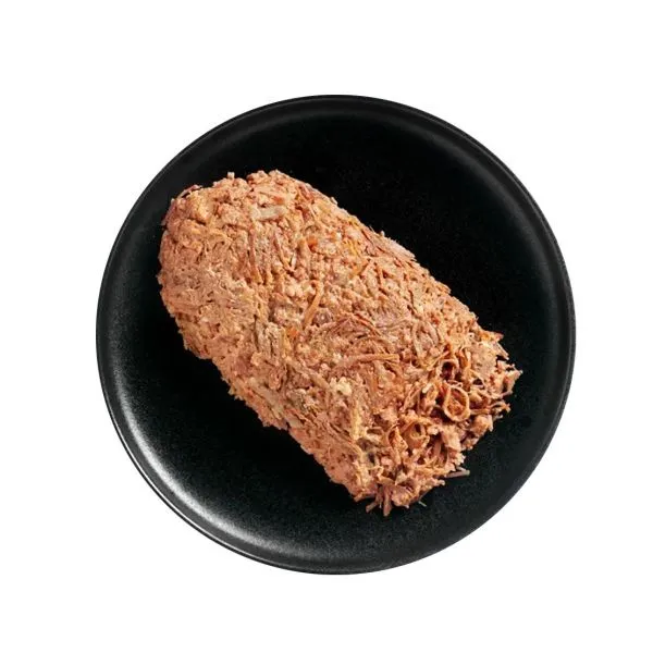 Ingrediente : pui, ficat, inimă, stomac (40%), bulion de carne (33,8%), carne de vită (14%), plămâni de vită (11%), coji de ouă uscate (0,5%), minerale (0,5%), somon ulei (0,2%)