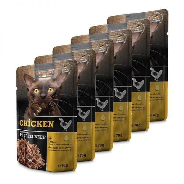 Leonardo este un pachet suculent de carne de pui cu adaos de carne de vită mărunțită, pentru pisici adulte.