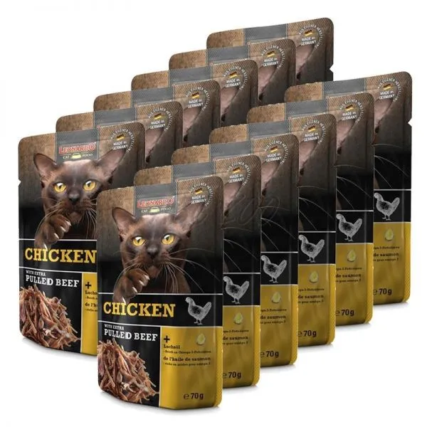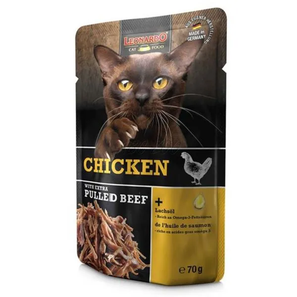 Leonardo este un pachet suculent de carne de pui cu adaos de carne de vită mărunțită, pentru pisici adulte.