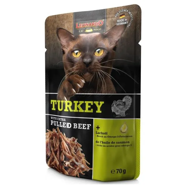 Leonardo este un pachet suculent de carne de curcan cu adaos de carne de vita tocata, pentru pisici adulte.