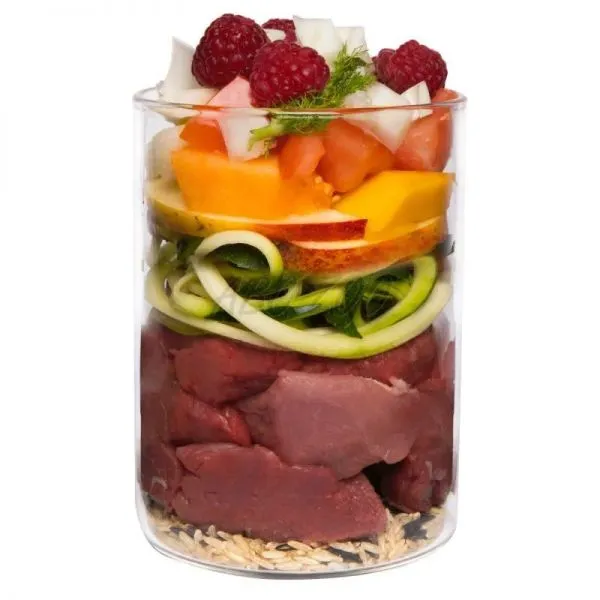 Raport Carne : orez natural : legume/fructe/herburi : alte ingrediente = 69 % : 5 % : 24 % : 2 %