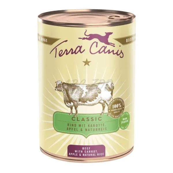 Hrana conservată Terra Canis din linia CLASSIC conține o proporție mare de carne și legume, fructe și ierburi proaspete. Pseudo-cerealele (de exemplu, mei, amarant, orez natural) bogate în nutrienți, ușoare și fără gluten sunt adăugate în cantități foarte mici, ușor digerabile pentru câine (4-10%). Ingredientele naturale (alge marine, argilă minerală, polen de flori, șolduri de trandafir, sare andină, drojdie de bere) furnizează vitamine, minerale și oligoelemente importante. Uleiul de rapiță furnizează acizi grași esențiali valoroși. Toate ingredientele sunt de calitate alimentară, adecvate consumului uman.