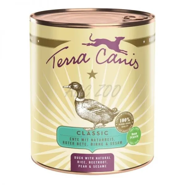 Terra Canis Classic este o hrană completă cu carne de rață, orez natural, sfeclă roșie, pară și susan pentru câini adulți din toate rasele.