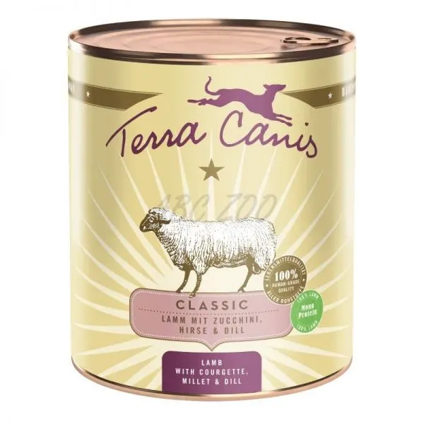 Hrana conservată Terra Canis din linia CLASSIC conține o proporție mare de carne și legume, fructe și ierburi proaspete. Pseudo-cerealele (de exemplu, mei, amarant, orez natural) bogate în nutrienți, ușoare și fără gluten sunt adăugate în cantități foarte mici, ușor digerabile pentru câine (4-10%). Ingredientele naturale (alge marine, argilă minerală, polen de flori, șolduri de trandafir, sare andină, drojdie de bere) furnizează vitamine, minerale și oligoelemente importante. Uleiul de rapiță furnizează acizi grași esențiali valoroși. Toate ingredientele sunt de calitate alimentară, adecvate consumului uman.