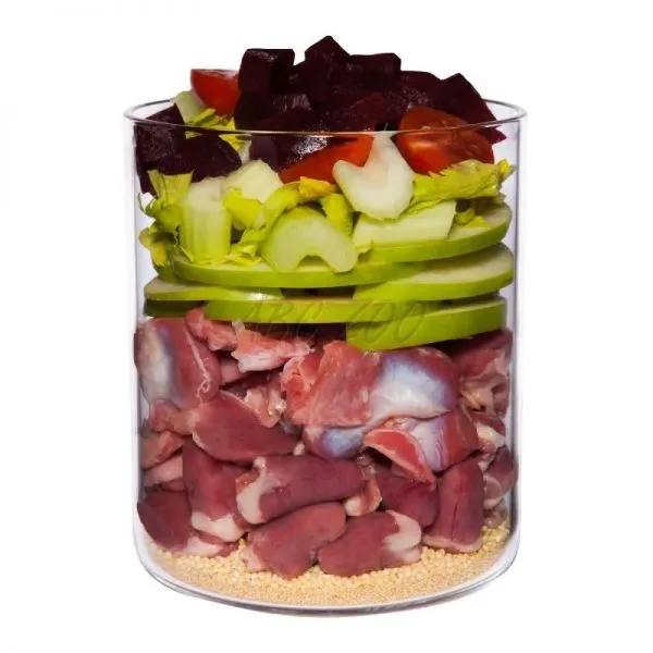Compoziție: Pui 46% (stomac de pui 22%, inimă de pui 12%, ficat de pui 7%, mușchi de pui 3%, piele de pui 2%), supă 16%, roșii 14%, pară 6%, mei 4%, amarant 4%, sfeclă roșie 3%*, tulpini de țelină 2%, minerale 1%*, ulei de rapiță, busuioc*, coajă de măceșe*, sare andină*, argilă minerală*, drojdie de bere*, cochilie de stridii*, făină de cocos*, spirulină*