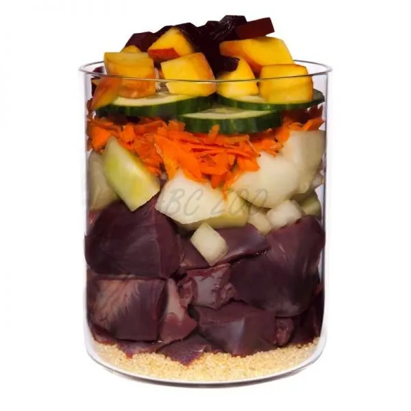Compoziție: Carne de vițel 44% (inimă de vițel 32%, plămân de vițel 12%), supă 19%, morcov 7%, mei 6%, țelină 5%, pepene 5%, castravete 4%, sfeclă roșie 3%, caisă 2%, minerale 1%*, ulei de rapiță, cerfeluș*, semințe de fenicul*, busuioc*, cimbru*, coajă de măceșe*, sare andină, cochilie de stridii*, argilă minerală*, drojdie de bere*, spirulină*