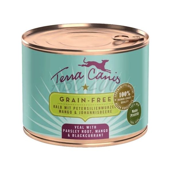 Terra Canis Grain-Free este o hrană completă cu carne de vițel, pătrunjel, mango și coacăze negre pentru câini adulți de toate rasele.