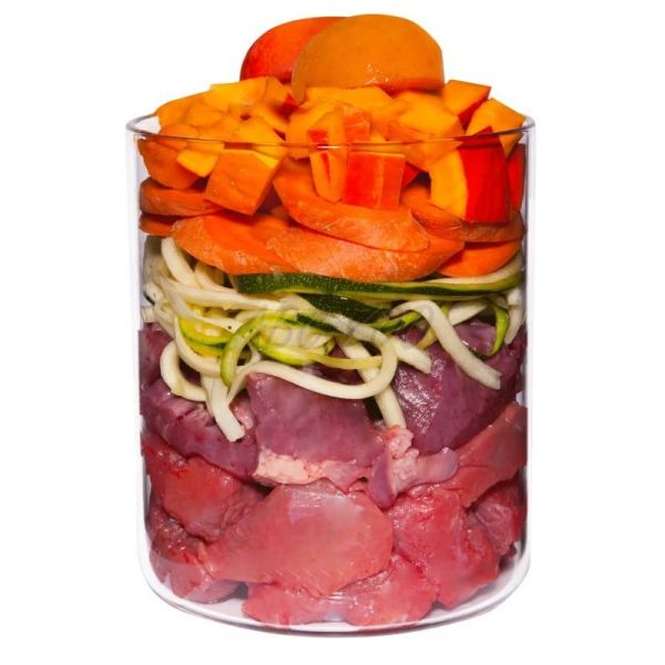 Compoziție: Carne de iepure (44%), ficat de curcan (15%), morcovi, dovleac, dovlecei (7%), caise (4%), făină de cocos, ulei de canola, făină de dovleac, drojdie de bere*, stridii*, busuioc*, salvie* (0,2%), măceșe*, semințe de fenicul*, semințe de in măcinate*, argilă minerală, sare andină*, alge marine*, minerale.