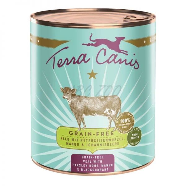 Terra Canis Grain-Free este o hrană completă cu carne de vițel, pătrunjel, mango și coacăze negre pentru câini adulți de toate rasele.