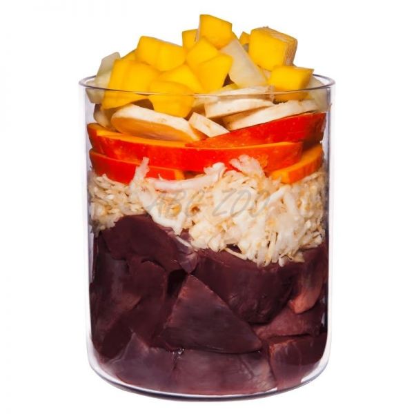 Compoziție: Inimă de vițel (43%), plămân de vițel (13%), pătrunjel (10%), dovleac, pepene galben, păstârnac, mango (3,5%), făină de cocos, coacăze negre (0,7%), ulei de rapiță, făină de semințe de dovleac, stridii*, drojdie de bere*, salvie* (0,2%), sare andină, păpădie*, semințe de fenicul*, creson*, argilă minerală*, alge marine*, minerale.