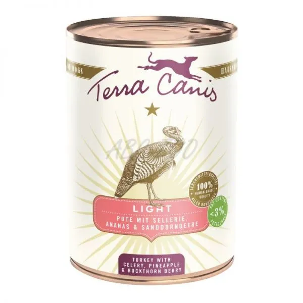 Alimentele conservate Terra Canis din linia Light conțin aproximativ 3% grăsime și sunt sărace în calorii - ideale pentru câinii supraponderali cărora li se recomandă o dietă hipocalorică și săracă în grăsimi. Acestea conțin numai carne slabă și fructe și legume cu conținut scăzut de amidon. Făina de nucă de cocos, uleiul din semințe de struguri și frunzele de anghinare susțin metabolismul grăsimilor și sunt, de asemenea, cunoscute pentru efectul pozitiv asupra nivelului lipidelor din sânge. Fibrele din coji de psyllium favorizează sațietatea.