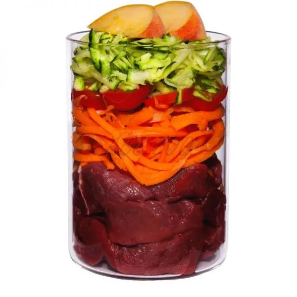 Compoziție: carne de mușchi de vânat 35%, supă 26%, morcov 6%, roșii 13%, castravete 9%, piersică 6%, minerale 1%*, făină de cocos 1%*, făină de semințe de dovleac 1%*, semințe de psyllium*, coji de psyllium*, drojdie de bere*, frunză de anghinare 0,1%*, busuioc*, păpădie*, coji de măceșe*, argilă minerală*, ulei de rapiță*, coajă de stridie*, spirulină*