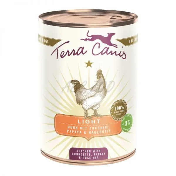 Alimentele conservate Terra Canis din linia Light conțin aproximativ 3% grăsime și sunt hipocalorice - ideale pentru câinii supraponderali cărora li se recomandă o dietă hipocalorică și săracă în grăsimi. Acestea conțin numai carne slabă și fructe și legume cu conținut scăzut de amidon. Făina de nucă de cocos, uleiul din semințe de struguri și frunzele de anghinare susțin metabolismul grăsimilor și sunt cunoscute, de asemenea, ca având un efect pozitiv asupra nivelului lipidelor din sânge. Fibrele din coji de psyllium favorizează sațietatea.