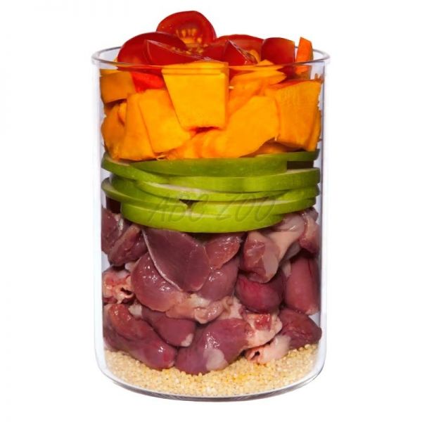 Compoziție:Inimă de pui (33%), stomac de pui (14%), dovleac (14%), mei, măr, roșii, mușchi de pui (6%), ficat de pui (4%), ulei de canola, făină de semințe de dovleac (1%), stridii*, drojdie de bere*, mușețel* (0,2%), pământ cu diatomite*, pulbere de măceșe*, argilă minerală*, alge marine*, minerale.