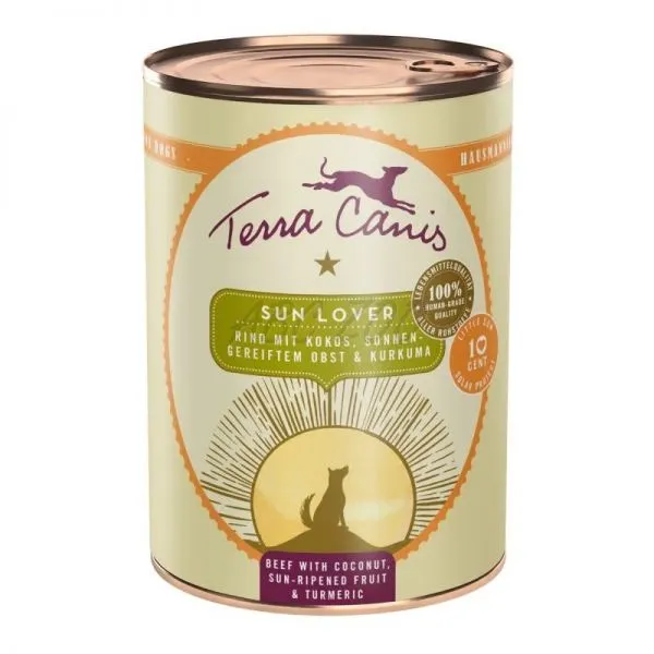 Terra Canis Sun Lover este o hrană completă cu carne de vită, nucă de cocos, fructe coapte la soare și turmeric pentru câini adulți din toate rasele.