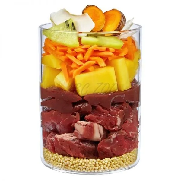 Compoziție: vită 43% (inimă de vită 28%, ficat de vită 6%, plămân de vită 9%), supă 19%, morcov 10%, dovlecel 9%, măr 4%, cartof dulce 4%, mei 4%, mango 1%, piersică 1%, kiwi 1%, pepene galben 1%, minerale 1%*, ulei de rapiță, făină de cocos 1%*, drojdie de bere*, semințe de floarea-soarelui*, maghiran*, cimbru*, turmeric 0,1%*, argilă minerală, cochilie de stridie, spirulină*