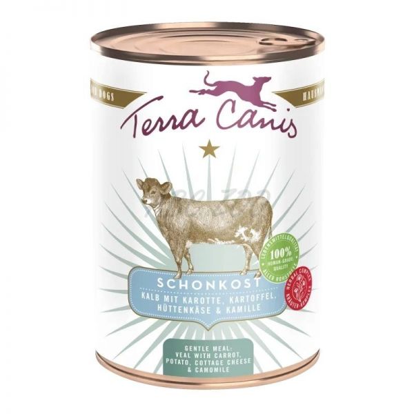Alimentele conservate Terra Canis din linia GENTLE MEAL sunt meniuri dietetice speciale fără cereale, bazate pe ingrediente ușor digerabile care susțin întregul tract digestiv. Carne slabă de vițel sau pui combinată cu cartofi, morcovi, fenicul, brânză de vaci probiotică, precum și făină de nucă de cocos. Ierburi sănătoase precum mușețelul, melisa, calendula, argila minerală și uleiul de chimen negru completează rețeta. Dezvoltată împreună cu medicul veterinar Hanna Stephan. Toate ingredientele sunt de calitate alimentară, adecvate consumului uman.
