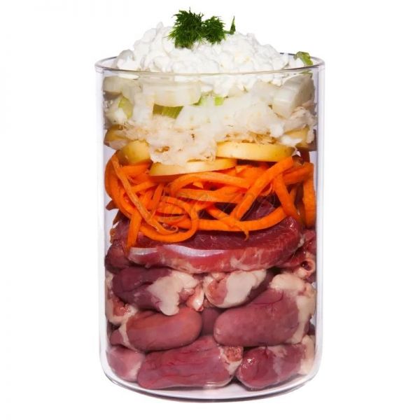 Compoziție: Pui 45% (inimă de pui 30%, stomac de pui 15%), supă 22%, morcov 13%, cartof 10%, țelină 3%, brânză de vaci 2%, fenicul, făină de cocos*, cochilie de stridii*, mușețel 0,4%*, argilă minerală*, gălbenele 0,2%*, chimen negru 0,1%*, sare andină*, spirulină*