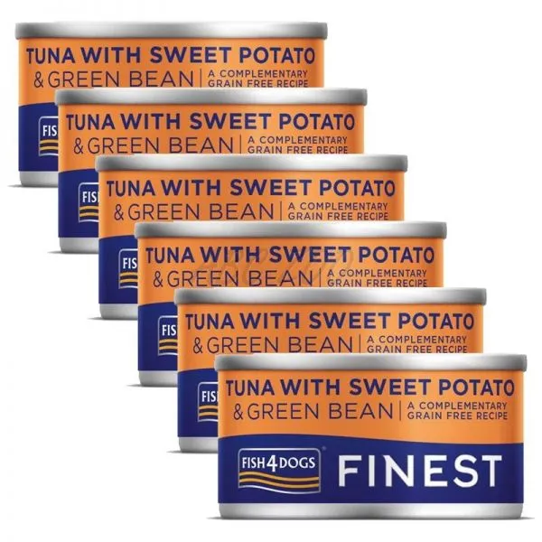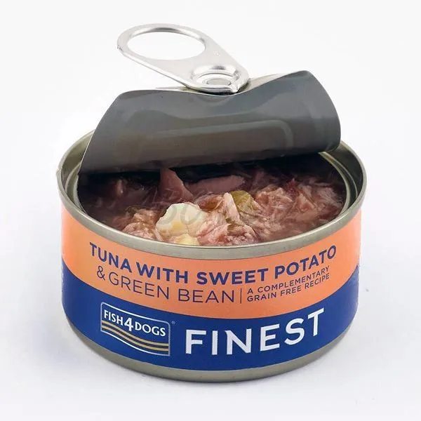 Fish4Dogs Finest Tuna with Sweet Potato este o mâncare conservată pentru câini cu ton, cartofi dulci și fasole verde, fabricată din pește și legume de înaltă calitate.