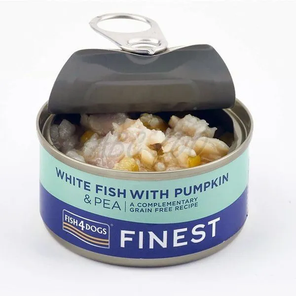 Fish4Dogs Finest White Fish with Pumpkin este o mâncare conservată pentru câini cu pește alb, dovleac și mazăre, fabricată din pește și legume de înaltă calitate.