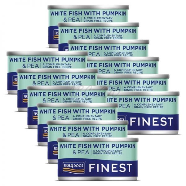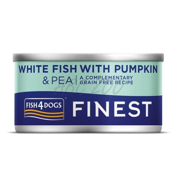 Fish4Dogs Finest White Fish with Pumpkin este o mâncare conservată pentru câini cu pește alb, dovleac și mazăre, fabricată din pește și legume de înaltă calitate.