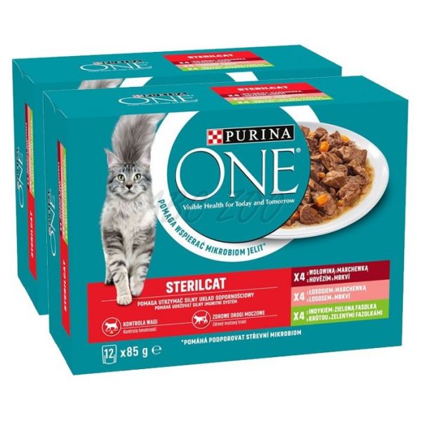 Pliculețe PURINA ONE STERILCAT - carne de vită, somon și morcovi, cu curcan și fasole verde într-un sos delicios 12 x 85 g.