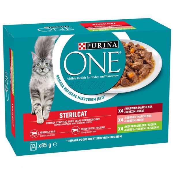 Pliculețe PURINA ONE STERILCAT - carne de vită, somon și morcovi, cu curcan și fasole verde într-un sos delicios 12 x 85 g.