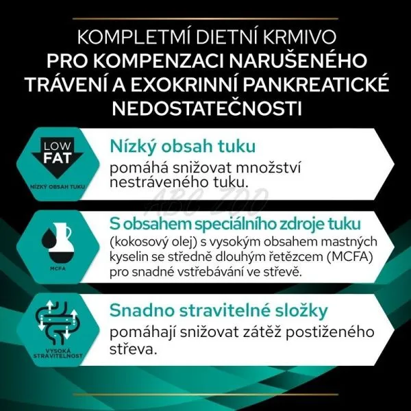 Purina Veterinary Diets este o hrană umedă completă, foarte digerabilă, cu conținut scăzut de fibre, pentru câini adulți, concepută pentru a compensa tulburările digestive și insuficiența pancreatică exocrină.