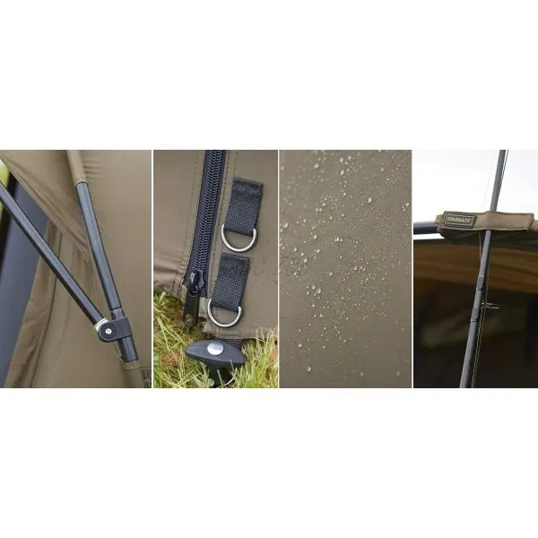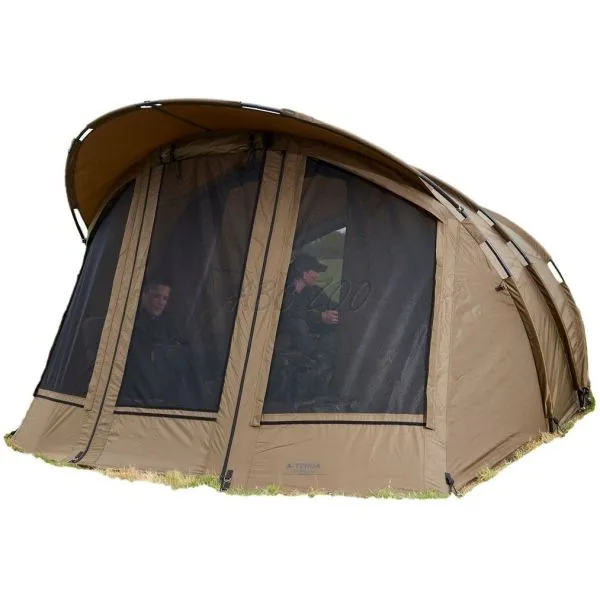 Cort extra mare pentru doi pescari și două paturi, cu un antreu spațios și o copertină de protecție împotriva ploii și soarelui. Spațiu suficient pentru o cantitate mare de echipament.