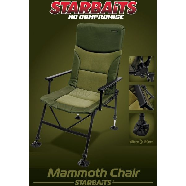 Scaunul Mammoth este un fotoliu de nouă generație cu cea mai înaltă calitate, funcționalitate și confort maxim. Structura specială din aluminiu este extrem de rezistentă și ușoară. Salteaua groasă este realizată din material ergonomic foarte confortabil (nylon 600D) combinat cu fleece călduros. Izolația perfectă protejează corpul de frigul de la sol. Finisajul de suprafață oferă durabilitate sporită și ușurință în curățare. Picioarele reglabile cu tălpi late împotriva afundării permit poziționarea confortabilă chiar și pe teren denivelat. Cotierele late sporesc confortul în timpul șederii. În partea superioară a spătarului este integrată o pernă suplimentară ca sprijin pentru cap. Spătarul este reglabil datorită unui mecanism solid cu balama.