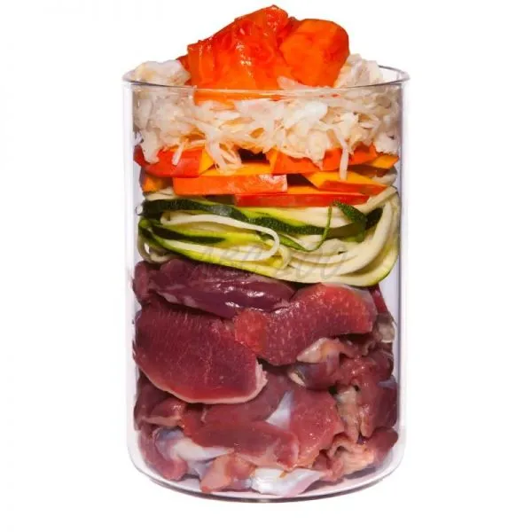 Compoziție: pui 46% (inimă de pui 29%, stomac de pui 11%, ficat de pui 6%), supă 23%, dovlecel 11%, dovleac 9%, papaya 6%, făină de cocos 1%*, făină de semințe de dovleac 1%*, minerale 1%*, păstârnac*, semințe de psyllium*, coji de psyllium*, drojdie de bere*, busuioc*, ulei de rapiță, păpădie*, coajă de măceșe 0,1%*, frunză de anghinare*, argilă minerală*, coajă de stridie*, spirulină*
