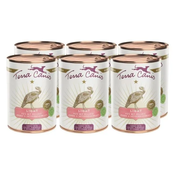 Alimentele conservate Terra Canis din linia Light conțin aproximativ 3% grăsime și sunt sărace în calorii - ideale pentru câinii supraponderali cărora li se recomandă o dietă hipocalorică și săracă în grăsimi. Acestea conțin numai carne slabă și fructe și legume cu conținut scăzut de amidon. Făina de nucă de cocos, uleiul din semințe de struguri și frunzele de anghinare susțin metabolismul grăsimilor și sunt, de asemenea, cunoscute pentru efectul pozitiv asupra nivelului lipidelor din sânge. Fibrele din coji de psyllium favorizează sațietatea.