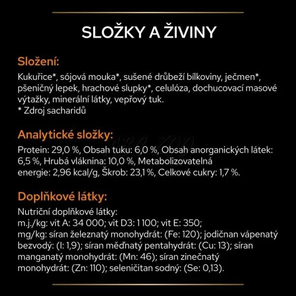 Ingrediente: Porumb*, Făină de soia*, Proteine uscate de pasăre, Orz*, Gluten de grâu, Coji de mazăre*, Celuloză, Aditiv de aromă, Minerale, Grăsime de porc *Surse de carbohidrați.