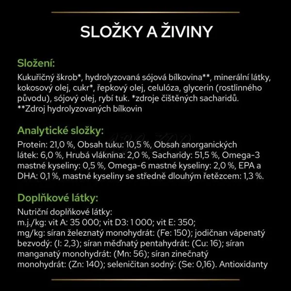 Ingrediente: Amidon de porumb*, proteină de soia hidrolizată**, minerale, ulei de nucă de cocos, zahăr*, ulei de canola, celuloză, glicerină (de origine vegetală), ulei de soia, ulei de pește