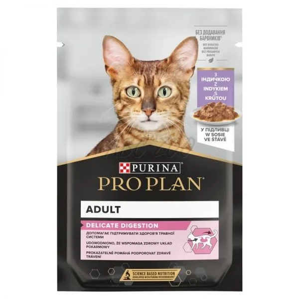 PURINA® PRO PLAN® Adult Delicate Digestion cu curcan în sos susține dovedit sănătatea digestivă și contribuie la menținerea unei pieli sănătoase datorită conținutului ridicat de acizi grași omega-3 și omega-6.