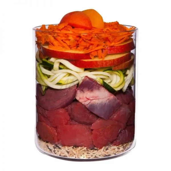 Compoziție: Vită 46% (inimă de vită 27%, ficat de vită 6%, plămân de vită 9%, mușchi de vită 4%), supă 15%, morcov 11%, dovlecel 11%, măr 8%, orez natural 5%, caisă 3%, minerale 1%*, ulei de rapiță, pătrunjel*, busuioc*, semințe de fenicul*, coajă de măceșe*, argilă minerală*, drojdie de bere*, cochilie de stridie*, spirulină*