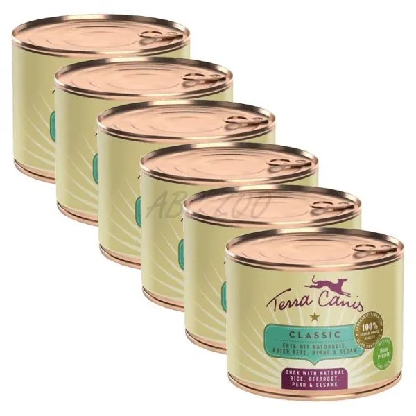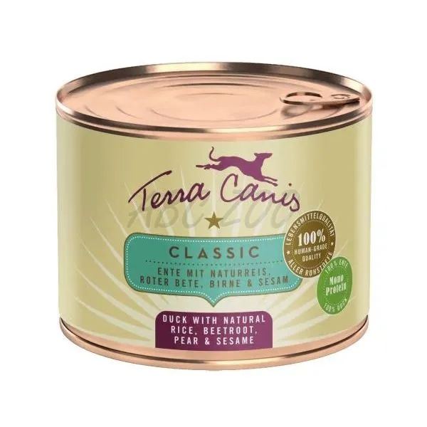 Hrana conservată Terra Canis din linia CLASSIC conține o proporție mare de carne și legume, fructe și ierburi proaspete. Pseudo-cerealele (de exemplu, mei, amarant, orez natural) bogate în nutrienți, ușoare și fără gluten sunt adăugate în cantități foarte mici, ușor digerabile pentru câine (4-10%). Ingredientele naturale (alge marine, argilă minerală, polen de flori, șolduri de trandafir, sare andină, drojdie de bere) furnizează vitamine, minerale și oligoelemente importante. Uleiul de rapiță furnizează acizi grași esențiali valoroși. Toate ingredientele sunt de calitate alimentară, adecvate consumului uman.