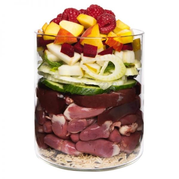 Compoziție: Inimă de rață (42%), ficat de rață (11%), pară (7%), piersică, fenicul, castravete, orez natural (7%), sfeclă roșie* (7%), zmeură (1,5%), ulei de rapiță, stridii*, susan măcinat* (0,4%), drojdie de bere*, chimen*, chimen mineral*, nucșoară sare*, maghiran* alge marine*.