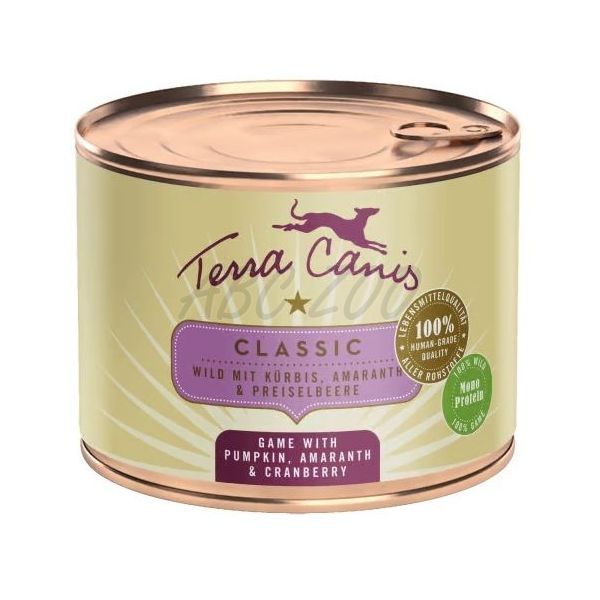 Hrana conservată Terra Canis din linia CLASSIC conține o proporție mare de carne și legume, fructe și ierburi proaspete. Pseudo-cerealele (de exemplu, mei, amarant, orez natural) bogate în nutrienți, ușoare și fără gluten sunt adăugate în cantități foarte mici, ușor digerabile pentru câine (4-10%). Ingredientele naturale (alge marine, argilă minerală, polen de flori, șolduri de trandafir, sare andină, drojdie de bere) furnizează vitamine, minerale și oligoelemente importante. Uleiul de rapiță furnizează acizi grași esențiali valoroși. Toate ingredientele sunt de calitate alimentară, adecvate consumului uman.