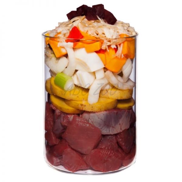 Compoziție:Musculare de cal (59%), cartof, dovleac (7%), nap (7%), fenicul (4%), păstârnac*, sfeclă roșie*, făină de sfeclă roșie*, făină de cocos, ulei de rapiță, ulei de stridii*, drojdie de bere*, salvie* (0,2%), păpădie*, flori de soc*, chokeberry*, sare andină, argilă minerală*, alge marine*, minerale.