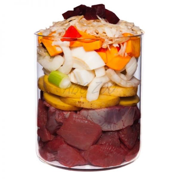 Compoziție:Musculare de cal (59%), cartof, dovleac (7%), nap (7%), fenicul (4%), păstârnac*, sfeclă roșie*, făină de sfeclă roșie*, făină de cocos, ulei de rapiță, ulei de stridii*, drojdie de bere*, salvie* (0,2%), păpădie*, flori de soc*, chokeberry*, sare andină, argilă minerală*, alge marine*, minerale.