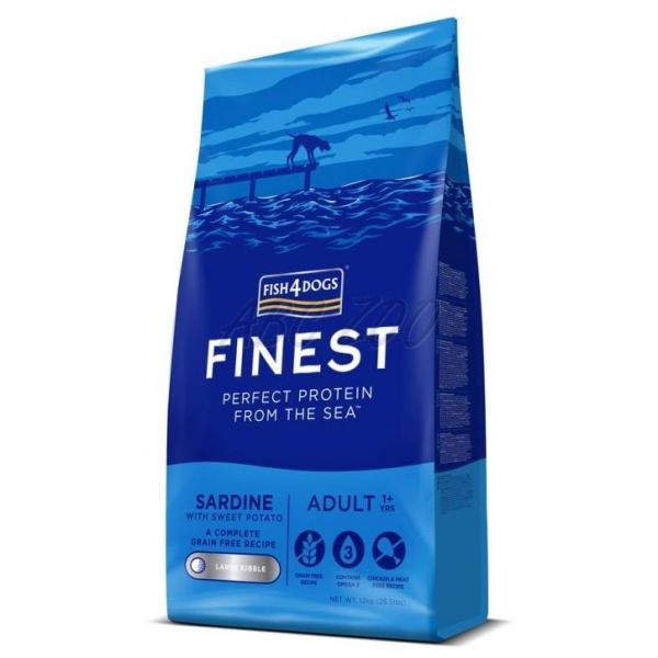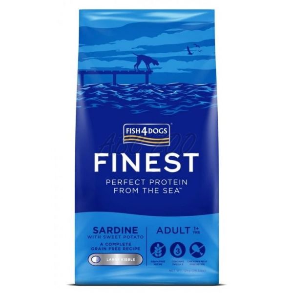 Fish4Dogs este o hrană sănătoasă și hipoalergenică pe bază de sardine și cartofi, cu adaos de ulei de somon, destinată câinilor de talie mare cu vârsta de peste un an.