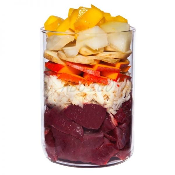 Compoziție: Inimă de vițel (43%), plămân de vițel (13%), pătrunjel (10%), dovleac, pepene galben, păstârnac, mango (3,5%), făină de cocos, coacăze negre (0,7%), ulei de rapiță, făină de semințe de dovleac, stridii*, drojdie de bere*, salvie* (0,2%), sare andină, păpădie*, semințe de fenicul*, creson*, argilă minerală*, alge marine*, minerale.