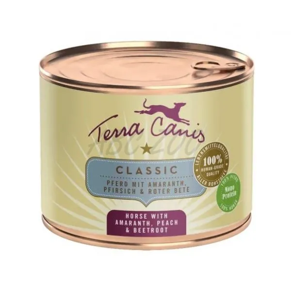 Hrana conservată Terra Canis din linia CLASSIC conține o proporție mare de carne și legume, fructe și ierburi proaspete. Pseudo-cerealele (de exemplu, mei, amarant, orez natural) bogate în nutrienți, ușoare și fără gluten sunt adăugate în cantități foarte mici, ușor digerabile pentru câine (4-10%). Ingredientele naturale (alge marine, argilă minerală, polen de flori, șolduri de trandafir, sare andină, drojdie de bere) furnizează vitamine, minerale și oligoelemente importante. Uleiul de rapiță furnizează acizi grași esențiali valoroși. Toate ingredientele sunt de calitate alimentară, adecvate consumului uman.