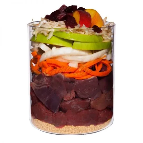 Ingrediente: Carne de cal 42%, supă 18%, morcov 7%, țelină 7%, amarant 7%, fenicul 5%, măr 5%, piersică 4%, sfeclă roșie 2%, minerale 1%*, ulei de rapiță, cimbru*, sare andină*, argilă minerală*, drojdie de bere*, cochilie de stridii*, spirulină*