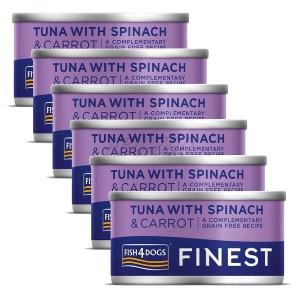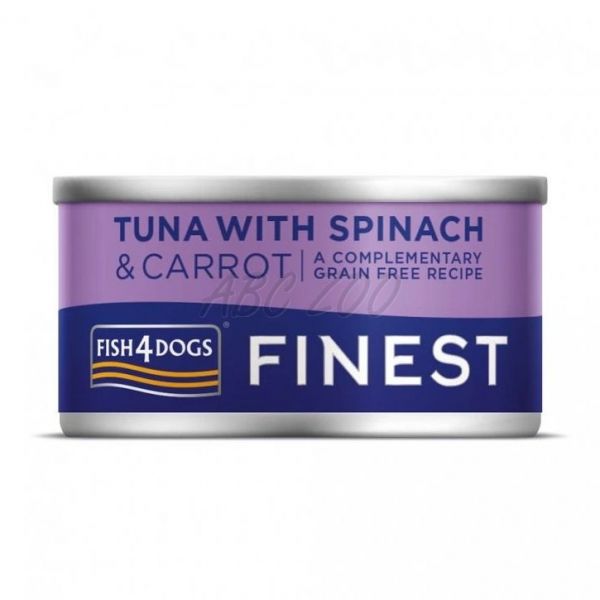 Fish4Dogs Finest Tuna with Spinach este o conservă pentru câini cu ton, spanac și morcovi, preparată din pește și legume de calitate superioară.