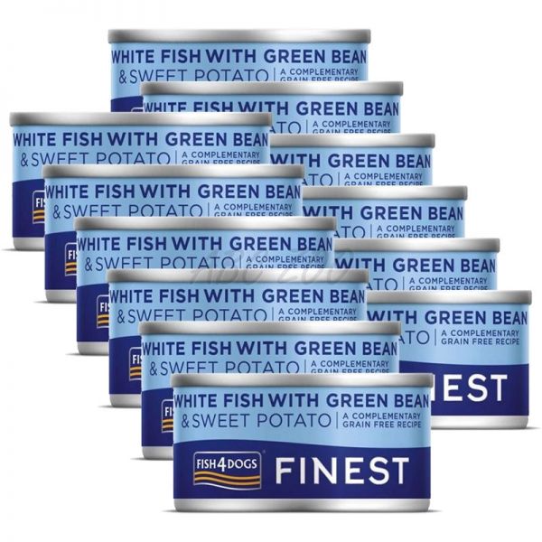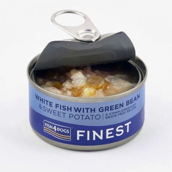 Fish4Dogs Finest White Fish with Green Bean este o conservă pentru câini cu pește alb, fasole verde și cartofi dulci, preparată din pește și legume de calitate superioară.