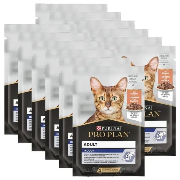 PURINA® PRO PLAN® Hrană completă pentru pisici adulte care trăiesc preponderent în interior, cu somon în sos. Ajută la reducerea formării ghemotoacelor de păr datorită conținutului de fibre și susține silueta și condiția fizică optimă.