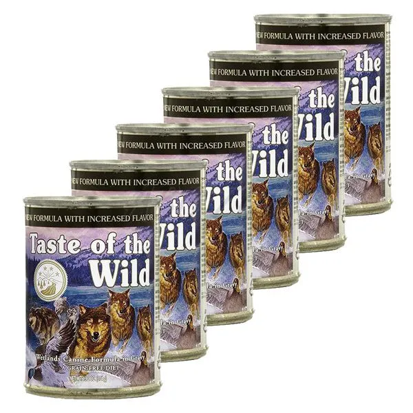 TASTE OF THE WILD Wetlands Canine este o hrană completă la conservă adecvată pentru câinii adulți de toate vârstele și rasele. Produsele acestui brand sunt foarte apreciate ca fiind alimente de calitate de către organizația Dog Food Analysis.